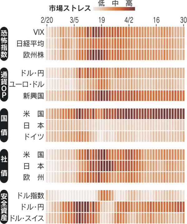 新型コロナウイルスまん延による景気低迷懸念から、世界の金融市場で緊張感(ストレス)が高まっている。そこで投資家の不安心理や景気動向を反映しやすい15の指標を元に「市場ストレスマップ」を作成した。色の濃さは緊張感の高まりを示す。