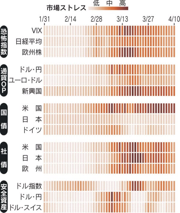 世界株安が進んだ3月中旬以降、ストレスは高止まりしてきたが、社債市場では米連邦準備理事会(FRB)による企業向けの資金供給策を背景に資金繰り不安が後退し、改善傾向が続いている。株式市場でも過度な変動への警戒感はやや和らいでいる。各国の経済対策や金融政策でストレスが一段と緩和されるかが注目される。