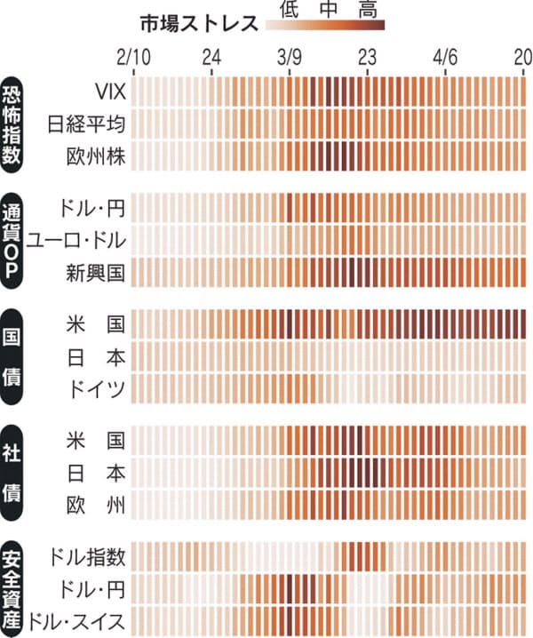 新型コロナウイルスまん延による景気低迷懸念から、世界の金融市場で緊張感(ストレス)が高まっている。そこで投資家の不安心理や景気動向を反映しやすい15の指標を元に「市場ストレスマップ」を作成した。色の濃さは緊張感の高まりを示す。