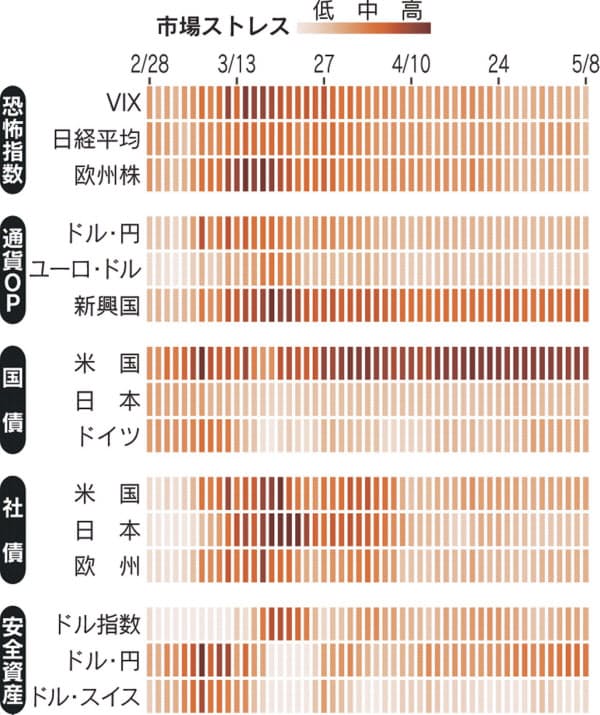 世界株安が進み市場のストレスがピークに達した3月中旬以降、米連邦準備理事会(FRB)による資金供給策などを背景に過度な警戒ムードは後退した。株式市場では米欧などでの経済活動の制限緩和を背景に景気の先行きへの期待が広がり、緊張感が和らいできた。各国の経済対策や金融政策でストレスが一段と緩和されるかが注目される。