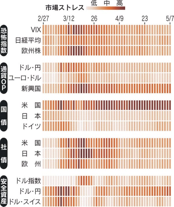 新型コロナウイルスまん延による景気低迷懸念から、世界の金融市場で緊張感(ストレス)が高まっている。そこで投資家の不安心理や景気動向を反映しやすい15の指標を元に「市場ストレスマップ」を作成した。色の濃さは緊張感の高まりを示す。