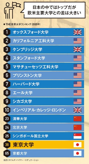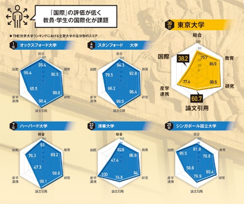 上で示しているのは英教育専門誌タイムズ・ハイヤー・エデュケーションの「THE世界大学ランキング」(2020年)の順位とスコアだ。東大の足を引っ張っているのは、「国際」の評価がとりわけ低いこと。英語が母国語でないことから不利な面はあるものの、留学生の比率が低いのは事実だ。特に学部生に占める比率は3.1%と20~30%が当たり前の海外一流大学との差は大きい。ここ10年程度の推移を見ても、あまり増えていない。国際化は道半ばだ。
