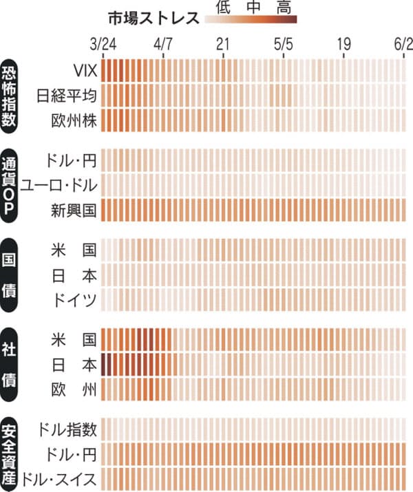 世界株安が進み市場のストレスがピークに達した3月中旬以降、米連邦準備理事会(FRB)による資金供給策などを背景に過度な警戒ムードは後退した。株式市場や社債市場では経済活動再開に伴う景気の底入れやワクチン開発への期待を織り込み、緊張緩和が進んできた。もっとも、足元では感染第2波への警戒感や米中対立への懸念がくすぶり、米国内での白人警官の暴行による黒人死亡事件への抗議デモの広がりも投資家の様子見姿勢を強めている。各国の経済対策や金融政策でストレスが一段と緩和されるかが注目される。